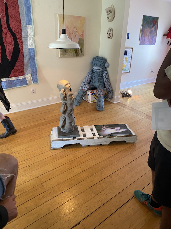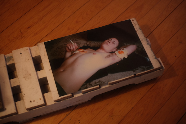 As I arrived early Saturday evening, I was surprised at the transformation in front of me: the well decorated home I knew from previous visits was now a white cube. The exhibition’s title, The Bar’s in the Kitchen, proved literal – the bar was in the kitchen and Maud was setting up drinks. Stepping further into the apartment, I maneuvered around a wooden pallet dividing the dining area. An overhead light normally used to illuminate shared meals now spotlighted Charlie Perry’s leaning ceramic stack of fused heads, which towered beside Fanny Desroches’s photo-portrait Sunny Side Up, whose fried egg-covered subject looked right back at me.
