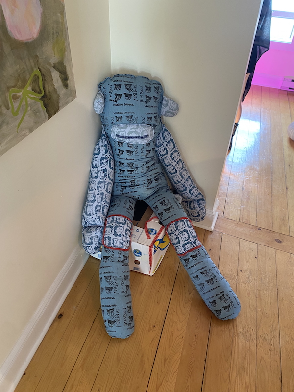 Seeing art against the backdrop of a home brought forth references to the domestic or emphasized traditional, quotidian craft. Caitlin Secondcost’s technical textile expertise was evident through her arresting quilt with its central black stalk topped with pink tendrils reaching skywards on a deep red background surrounded by a light blue frame. Her twin dolls, clad in matching red dresses and static, embroidered expressions crowned with real human hair (which reportedly belonged to a former colleague from a construction site), sat on a shelf observing gallery goers quietly from a corner.