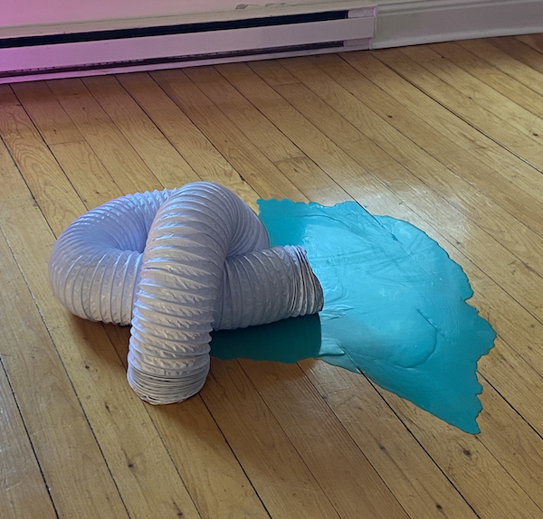 I stepped gingerly around Maud’s Another Leaky Vessel, a drain pipe exuding a pastel turquoise goo that curved in on itself, to circulate the living room and view the wall-mounted works, including four of Jordan Johnson’s playful abstractions, Rielle Doucette’s enchanting daydream of a painting Flamingo Field, Chelsea MacDonald’s cyanotypes of everyday objects, and Charlie Perry’s distorted, figurative Grappes.