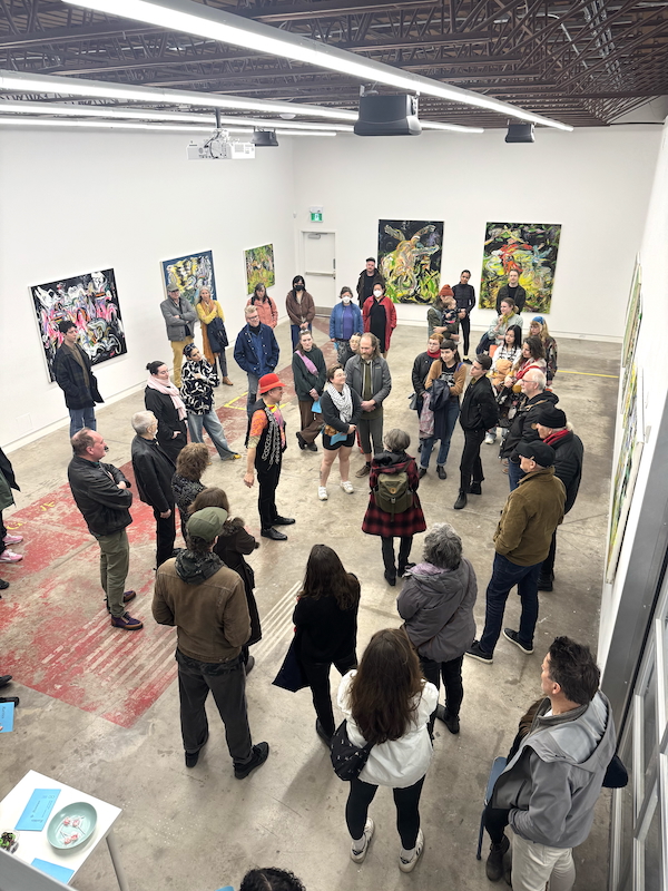 Mitchell Wiebe gives an artist talk during Rarities & Remixes, February 28 – April 26, 2025 (courtesy: The Blue Building Gallery; photo: Emily Falencki)