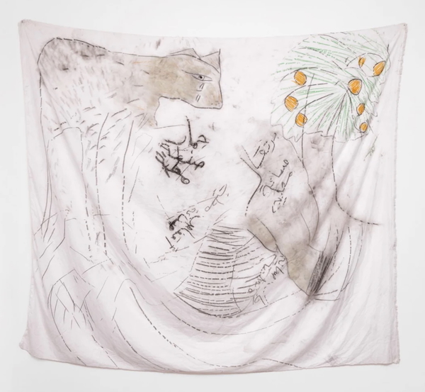 Aysha E Arar, Homemade Donkey, Homemade Oranges and Homemade Cages, What Else?, 2023, charcoal, ballpoint pen, and pastel on kaftan