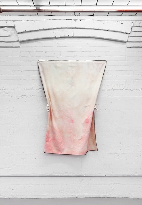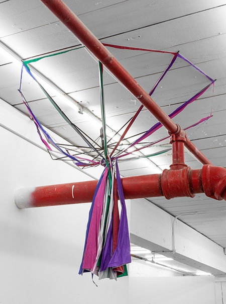 On entering the gallery, I notice an umbrella standing in the corner, threadbare and tattered. “Does that belong to someone?” I wonder. Looking up, there is another umbrella, this one turned inside out, its material dangling as it spiders over a fire engine red pipe. Both are the work of South Korean-born artist HaeAhn Kwon, who has found a way to suspend (literally) the familiar frustration and absurdity of carrying an utterly useless umbrella during a rainstorm. A little further into the gallery, interdisciplinary artist Walter Scott shows two sculptural pieces. One is a piece of cloth tinged with red, hanging on a wall with two disembodied, comical white hands reaching from behind, cinching the material at its waist. Directly opposite is a pulley structure (of sorts) supported, somehow, by a tote bag. Two white circles of paint are on the ground, mirroring the cloth-clasping hands before it. Even further in, Jeremy Laing’s giant hangers are partially woven with yarn, and equally oversized ceramic buttons hang from their thread.
