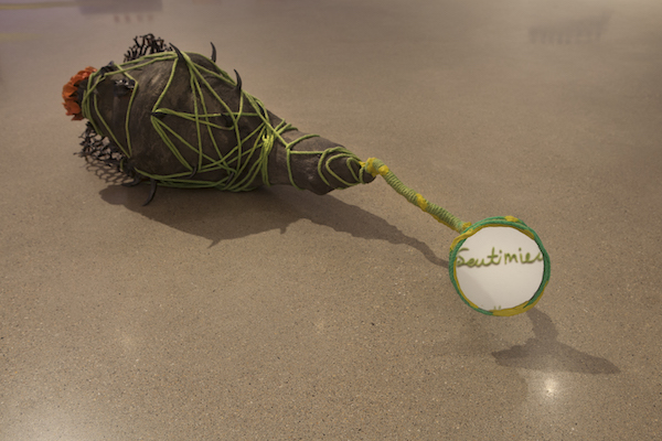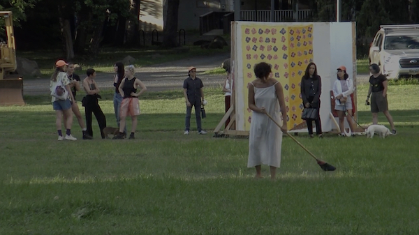 According to its curator, the exhibition illuminates memory-marking. Cadence Planthara memory-marks by creating an alter consisting of paintings, functional sculptures, and found objects. Informed by and referencing her ancestral lineage and familial histories, she maps a genealogy of recollections, fragmented stories, and residual memories. June Canedo de Souza’s installation O Escândalo also explores memory-marking in thick time. The single-channel video accompanying her installation documents a performance enacted in an open field as well as an installation evoking a household interior. In repeated movements, the artist cartographs recollections of her childhood. By sweeping in and around her devised landscape, she memory-marks histories of her immigrant family, as well as the domestic jobs her parents took on to sustain her upbringing.