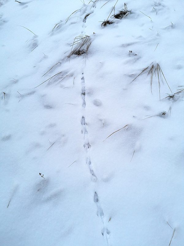 Recently, when driving home from my studio, I encountered two bright eyes reflected in the headlights of my car. I watched as some four-legged nighttime traveler confidently trotted off the road and into the woods. Parking the car, I went to look at the set of paw prints left in the snow. I could see their spacing extend as the creature’s slow trot turned into a jog. The prints, likely from a coyote, ran parallel to a collection of other recent marks from dogs and a rabbit, and a couple wiggly squirrel tracks. I love to see this archive of recent forest dramas.