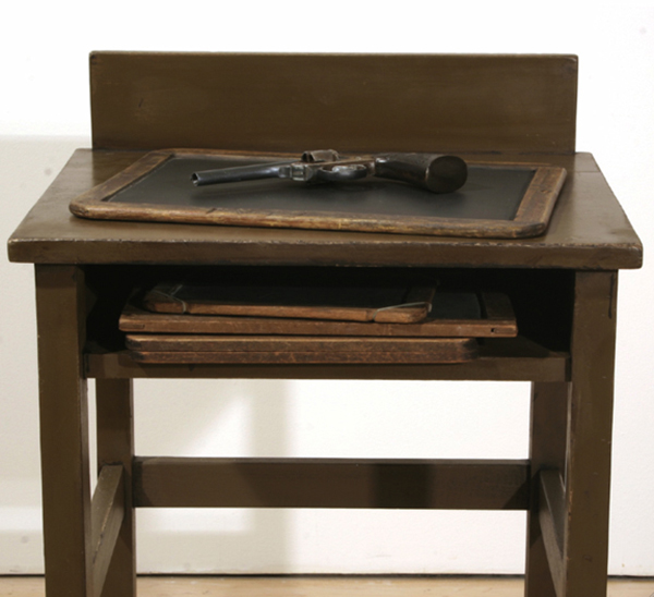 Vija Celmins, Table with Gun, 2009-10, three found tablets and three made objects (wood, bronze, acrylic paint, alkyd oil, pastel (© Vija Celmins; photo: Matthew Marks Gallery; courtesy: private collection)