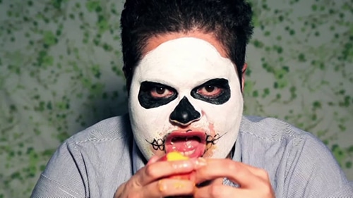 The Splits by Allison Hrabluik presents a series of vignettes of individuals performing a range of activities. This piece correlates each activity through sound in an intricate woven narrative. And in Salote Tawale’s videos the artist performs actions in an outré but honest way: singing Creep by Radiohead in the dark, a cappella; or in black and white face paint, eating fruit with total abandon, the paint slowly rubbing off with each bite.