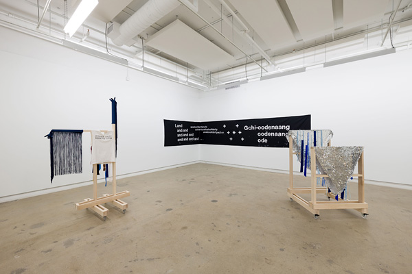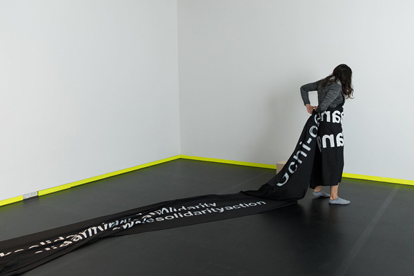 Maria Hupfield, Solidarity Acknowledgement Banner, 2017, cotton and acrylic, 24 × 4 in. Photo by J. Bascom.