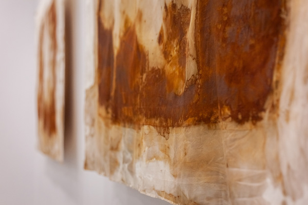 Stephanie Fortin, 43° 34′ 0.282″ N, 80° 4′ 23.86″ W and 43° 34′ 0.162″ N, 80° 4′ 23.73″ W (installation view; foreground and background), 2024, silk, rust, acetic acid, 142.2 x 175.3 cm and 142.2 x 182.9 cm. Photo: Catherine Chan