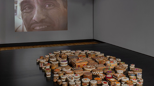 Do You Remember Love brings together artist Susan Mogul’s 1997 video I Stare at You and Dream with a collection of quillboxes from the Tower Hill Museum in Parry Sound. Juxtaposing these disparate forms of expression, the installation draws out themes across the two bodies of work, including women’s identity, family, relationships, and the quest for home. Filmed in Mogul’s Highland Park neighbourhood of Los Angeles, the film offers an intimate, intertwined narrative that is rooted in shared history and enduring relationships, as is the collection of quillboxes. Posing the question “do you remember love”, the exhibition positions the handmade quill and birchbark boxes as not only expressions of love but as acts of love for self, place, and one another that are to be recalled, enacted, and remembered. read more >