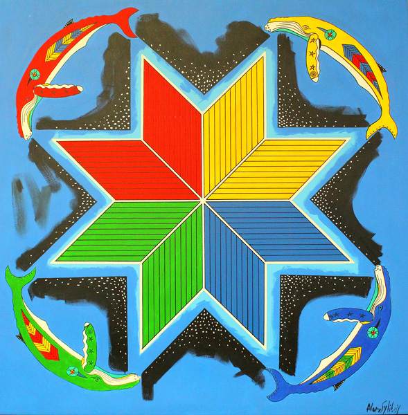 Alan Syliboy, Star and Four Direction Whales, 2022, acrylic on canvas. Collection of Dalhousie Art Gallery.