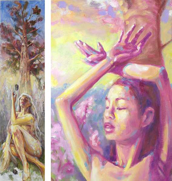 2) Left: Depicts an older woman resting under an old rewood tree. She is reaching for a pinecone. Right: Shows a detail of a young woman’s face lit by the sunrise.