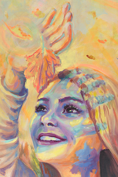 3) Depicts a young girl bathed in a colorful light and surrounded by colorful falling leaves.