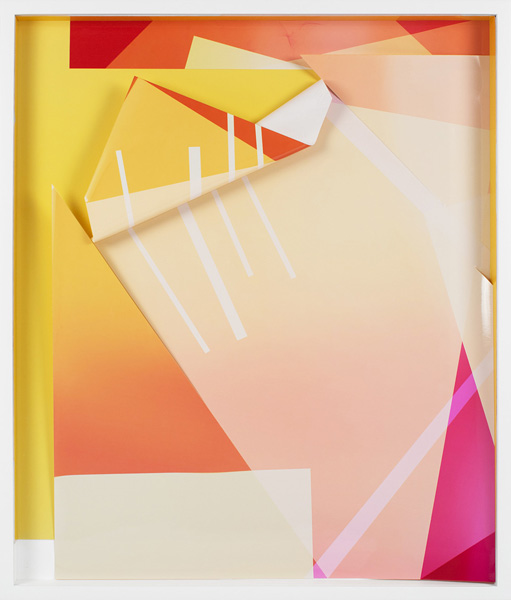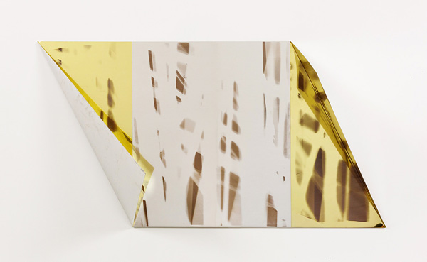 Working with aluminum, the material used to create traditional tintypes, Friges explores the relationship between the soft curvatures of darkroom photographic paper and integrating the rigidity of this new material. The tintypes were created in a darkroom without a camera, a place where light and shadows take precedence over any recognizable image. Inspired by Andy Warhol’s “Shadows” series from 1978-79, she explores the one-of-a-kind nature of the tintype and creates a production line of 20 x 24 inch wet plates that all contain comparable patterns of light and shadows. Unlike traditional tintype processes which utilize black polished aluminum, Friges reimagines the process today using abstraction as the subject and highly reflective, colour saturated aluminum substrates as a material. Like her previous works, “CMY RGB” and “Untitled Color,” the second stage of her process is to take the plates outside of the darkroom working with industrial sheet metal machinery. She purposefully bends the metal plates and reflects the image against itself, breaking the often static and rectangular nature of the object we’ve come to define as a photographic standard.