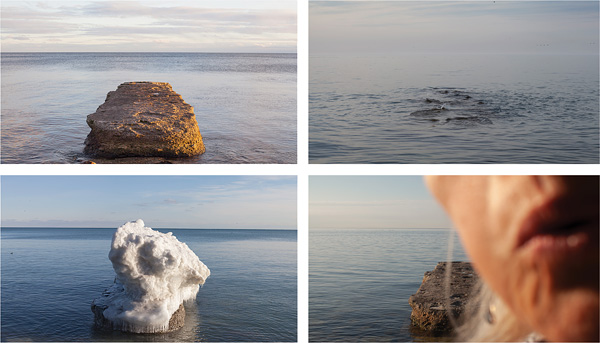 April Hickox’s long-term photographic series Vantage Point–Passing, reflects her continued exploration of the relationship between humans and the land. A long-time resident, community member and activist for the Toronto Islands, Hickox photographed and filmed a single groyne for almost two decades, returning to the same vantage point to observe shifting water, sky, climate, and season, and to note how people, animals, and boats moved through this sustained frame. Her unwavering, repetitive practice became an act of deep looking and a meditative focus on life’s one constant: change. These images invite viewers to pause, observe, and consider their own connection to the land and to experience the quiet reverence that animated Hickox’s lifelong, prolific practice.