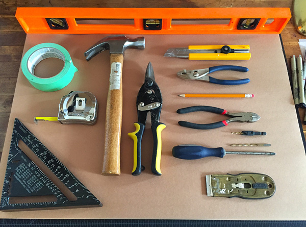 1. On a worktable there are several colourful and neatly arranged everyday work tools that are used by an art installer.