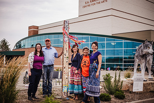 Lana Wilson (Manager of Education Programs), Elder Curtis Breaton, Ashley Smith, Elder Liz Settee, and Leah Marie Dorion pose with the Métis Lobstick, part of the annual Intergenerational Metis Artist Mentorship Program. Photo by: All My Relations Photography