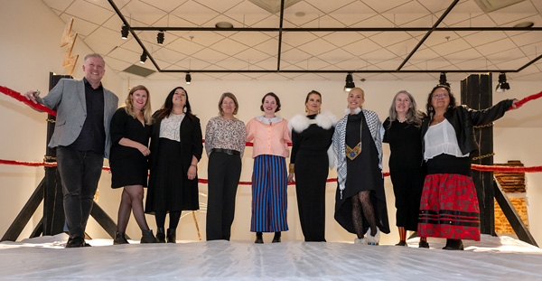 Left to right: Jonathan Shaughnessy, Sarah Moore Fillmore, Dr. Heather Igloliorte, Jane Isakson, Aubyn O’Grady, Randi Nelson, Jeneen Frei Njootli, Meshell Melvin, Jackie Olson. Photo: Bruce Barrett