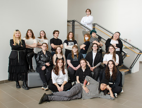 Pierre Lassonde School of Fine Arts Graduating Class of 2024. On the stairs: Mackenzie Chase. From left to right: Bingbing Wang, Shivanya Ra, Nasya Owens, Jonah Dysart, Olivia Searle, Autumn Martin, Bex Steinberg, Jolie Jeddore, Marilyn McDonough, Sarah Rogers, Bailey Cameron, Kiernan Hastey, Ella Graham, Eva Pestrin, Lydia Paterson, Lily Beamish, Ranz Jaren Tayo Bontogon. Photo credit: Karen Stentaford.
