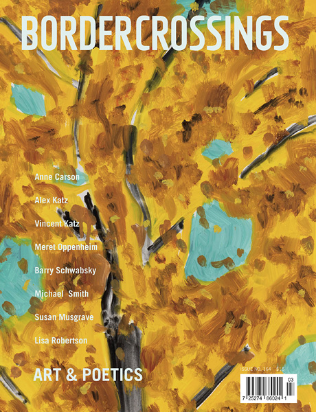 For painter Alex Katz poetry was central right from the start. Go back to the 60s when poets were where he found himself located because, “I thought the poetry scene was very radical and had a lot of energy. That’s where I wanted to be,” he told Border Crossings. This supportive productive collaboration continued through his career and in this issue we also talked with Vincent Katz, asking if he had early memories of growing up surrounded by poets. His response was peopled by the poets in this milieu: Frank O’Hara, Kenward Elmslie, Joe Brainard, Ted Berrigan, Ron Padgett, Bill Berkson, Anne Waldman, Lewis Warsh. A brief biographical note indicates the outcome of this setting. Vincent Katz is a poet, translator, critic, editor and curator.