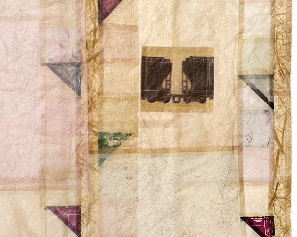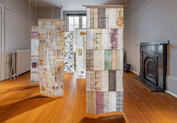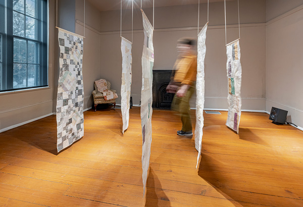 The quilts interpret family interviews and the artist’s grandmother’s quilting practice. Constructed to Marion’s approximate height and made of translucent paper layers, the quilts feature hand-printed imagery representing her values and life. Each quilt reflects a version of Marion, as translated through two generations.