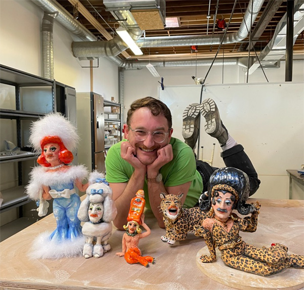 Jonah Strub is a Toronto-based ceramic sculptor. Jonah’s artwork is a visual love letter to the aesthetics of camp, kitsch, musical theatre, Yiddish humour, and drag. Jonah strives to project joy and playfulness through his work. By using humour, bright colours, animal prints, and bushels of body hair, Jonah highlights the joys of Matzo ball-flavoured femininity, effervescent queerness, the beauty of bric-a-brac, and the opulence of outrageous up-dos.