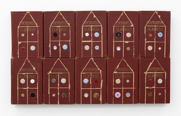 Bronson Smillie, L’encyclopédie de la jeunesse (red), 2023, full encyclopaedia set, felt pads, buttons, furniture sliders, wood. 19.5 x 33 in. Photo: Benny Xu