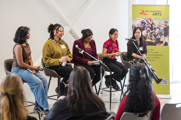 Pictured (from left to right): Invited youth panellists Faith Rajasingham, Jasmine Vanstone, Anjalee Nadarajan, Aswani Siwakoti, and Maria Patricia Abuel share their experiences at Next Generation Arts’ Building Youth Arts Careers launch event, March 28, 2026, at the Clark Centre for the Arts. Photo by Kat Rizza Photography.