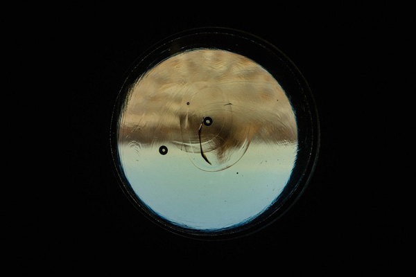 2) A circular image appears in the middle of a black background. In it, an out-of-focus desert scene appears upside-down. The handmade quality of the lens producing this image is readily visible, with many streaks and imperfections on its surface.
