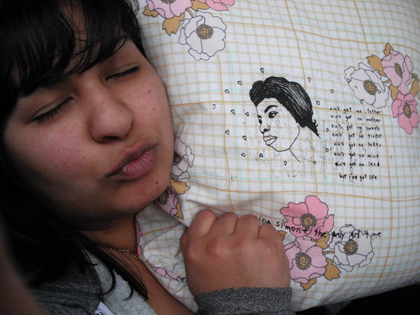 Ste-Émilie Skillshare collective member Tasha Zamudio posing with a screen-printed pillowcase by fellow member Heidi Cho, 2010. Image courtesy of Daniel Mack.