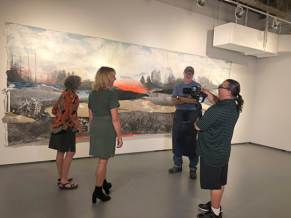 3. A photograph of four individuals in a gallery setting, one individual is filming the others, and there is a large painting on the wall behind them.