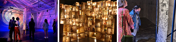 2. Collage depicting three art installations: silhouettes of people standing in the Bank of Canada Vault at the Diefenbunker surrounded by multi-coloured lights; a wall of stacked cardboard boxes with glowing lights and flowers inside; two people looking at a large woven paper mural of black and white photographs.
