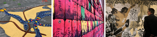 3. Collage depicting three art installations: painted map of the Ottawa region on a canvas with colourful beadwork outlining rivers, roads, and place names; multiple small red, green, and yellow numbered identification tags hanging side-by-side in rows; a person stands in front of a collaged mural of grayscale and sepia protest imagery from the Cold War.