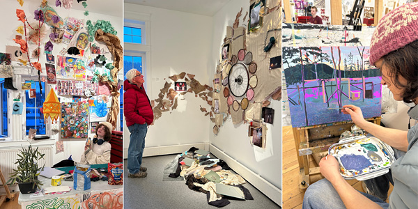 Images (left to right): Andrew Kearns, 2024-25 Foundation Year Student. Kali Kelbert, 2025-26 Foundation Year Student, Caz RK, installation, (regrettably tall) x (excessively wide), 2025. Sam Huxley, 2024-25 Foundation Year Student.