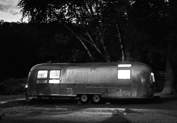 2. Black-and-white nighttime scene of a vintage trailer parked among trees. Soft light glows from its windows, contrasting with the dark forest surroundings. The trailer sits on a dirt or gravel surface, creating a quiet, slightly eerie atmosphere.