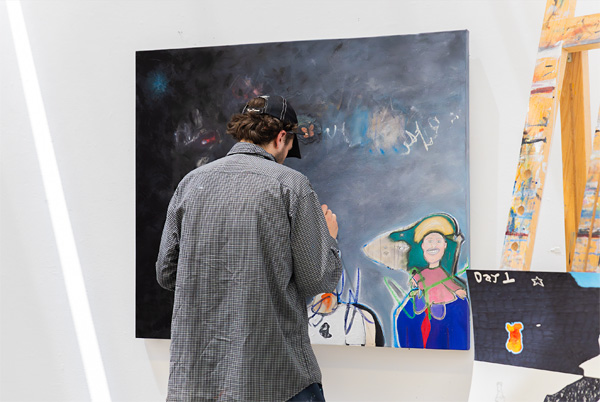 3. An art student painting a large, abstract painting in a bright studio space.