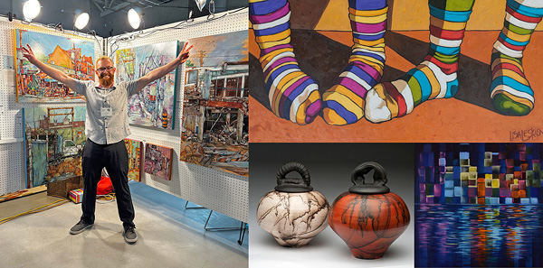Images (left to right): 2D Artwork by Jon Shaw, Sole Mates by Lisa Leskien, Ceramics by Shu-Chen Cheng, City At Night by Melina Cossio.