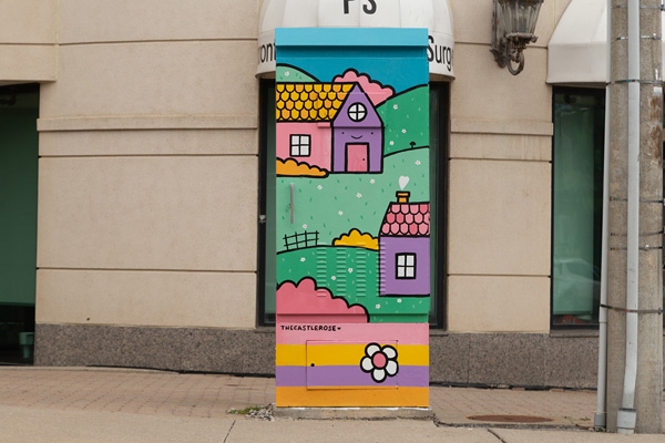2. Photo of a painted traffic signal box designed as part of the Outside the Box program by artist TheCastleRose. The design features a bright illustrative style depicting several cottage style houses against a backdrop of rolling green hills.