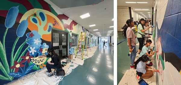 Images (left to right): Artist Julia YH painting mural at Glen Abbey Community Centre, 2024. Youth painting mural with artist Julia YH at Glen Abbey Community Centre, 2024.