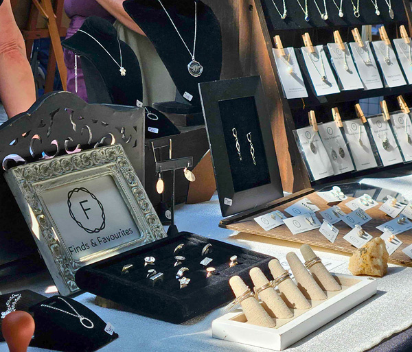 Vendor Booth – Find and Favourites (Artist), silver jewelry, rings, earrings and necklaces displayed.