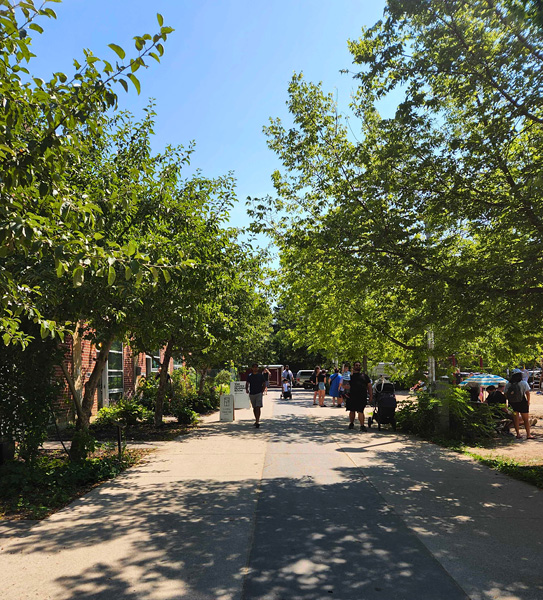 Shady tree lined walkway through public park at Wychwood Barns Park just outside of the indoor Market area.