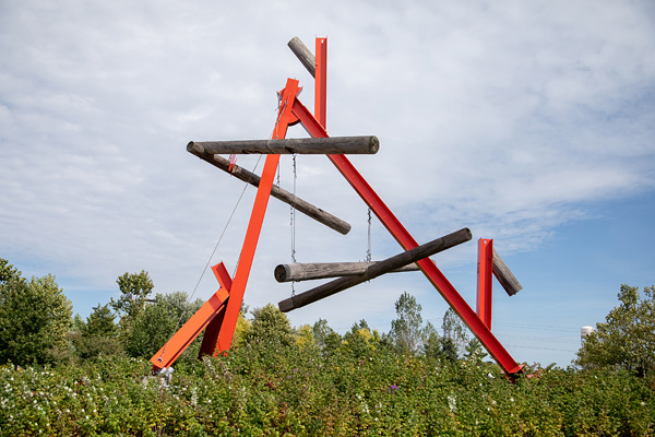 1. Mark Di Suvero’s No Shoes sculpture, consisting of orange steel beams and wooden logs.