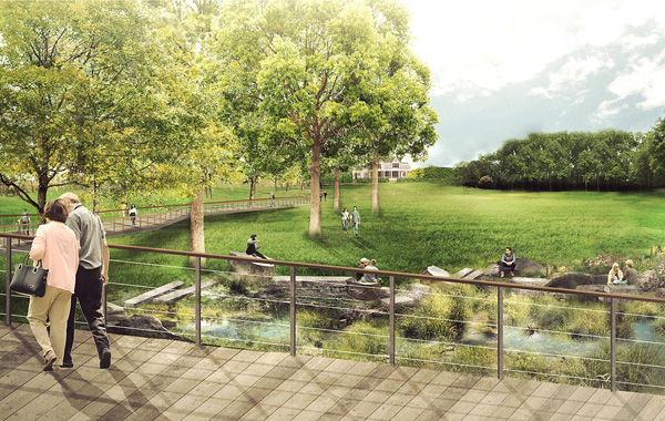 Bridge entry and engineered wetland. Rendering courtesy of PLANT Architect Inc.