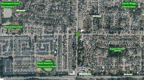 Newton is Surrey’s most populous town centre and is home to many residents of South Asian heritages. This intersection is in a highly residential area in southwest Newton, with two parks and two elementary schools in the immediate vicinity. The Surrey Zoo, which was operated by the Galicz family, existed in this location between 1967 and 1977.