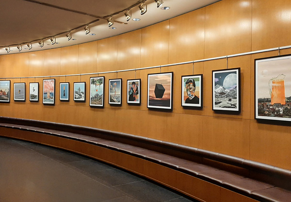 The gallery is a unique exhibition space, with a curved, wooden hanging wall that includes a 48-foot picture rail, and 48 inches of vertical hanging space. The space is ideal for displaying two-dimensional artwork, hung using the existing suspended rod picture rail. Each piece of artwork must work with this hanging system.