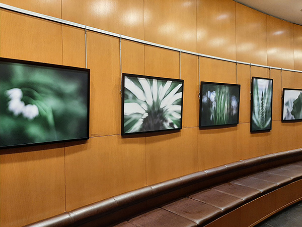 The gallery is a unique exhibition space, with a curved, wooden hanging wall that includes a 48-foot picture rail, and 48 inches of vertical hanging space. The space is ideal for displaying two-dimensional artwork, hung using the existing suspended rod picture rail. Each piece of artwork must work with this hanging system.