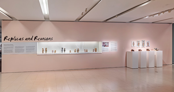 3. An installation view of in the Gardiner lobby featuring ceramic works in a long case and on free-standing platforms, as well as four paintings. The walls are light pink. The title of the exhibition, “Replicas and Reunions”, is printed on the wall.