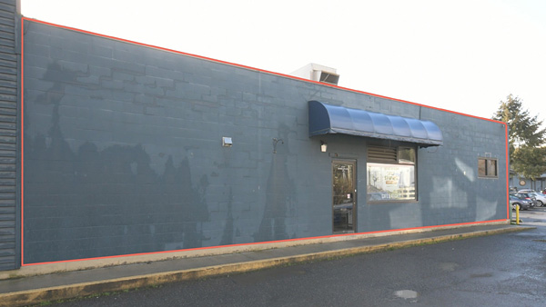 Special Considerations: The delineated portion of the wall has the above-listed measurements. The mural may expand above and below, to the dotted lines. The windows cannot be painted over. There are propane tanks in front of the wall which cannot be painted.
