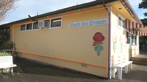 Special Considerations: This is a part of a larger wall that continues behind foliage and gardens. A smooth/aesthetic transition from the mural to the non-mural is critical to the design. The delineated portion of the wall has the above-listed measurements. The mural may expand below to the dotted lines. The windows cannot be painted over. The ice cream signage will be removed and will not be going back up.
