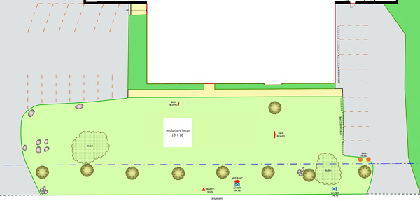 The sculpture will be installed on one of the lawns at Industrial Arts. The site features an 18 x 18 ft raised platform base which must be used, though artists are also welcome to utilize the rest of the lawn area if it serves their concept.