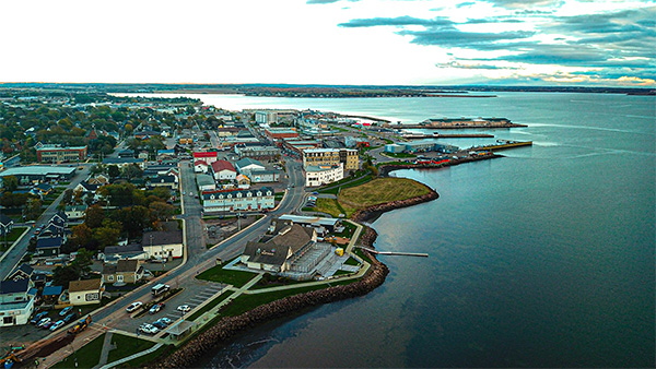 Aerial view of downtown Summerside and Baywalk Boardwalk, City of Summerside
